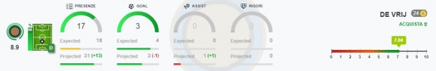 De Vrij: il suo valore di mercato sta lievitando, grazie a ripetute performance positive. La difesa a 3 (o 5, a seconda dei punti di vista) lo esalta, mentre invece sembra penalizzare il suo compagno di reparto, non pienamente a suo agio da centrodestro. Puntiamo decisi sulla continuità, sperando che possa fare la differenza anche in fase realizzativa.