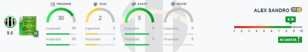Altro profilo interessante è quello di Alex Sandro (17). L’esterno mancino basso della Juventus non dovrebbe essere tra le “vittime” del turn over di Sarri. Dovrà spingere più che difendere, vista la differenza di valori con gli avversari di giornata. Sono 270 i minuti accumulati in campo sin qui dal brasiliano, a riprova della grande fiducia che il tecnico ex Chelsea ripone in lui. È tra i profili consigliati dall’Allenatore in Seconda FCO, grazie ad un FantaFactor complessivo di 8.36. Da lui ci si attende, sul piano statistico, qualche goal e almeno 5 assist in stagione.