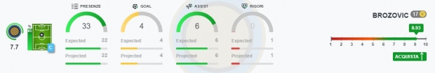 Tra i centrocampisti più interessanti di questa giornata, troviamo Brozovic, che assicura un buon ritorno in termini di fantavoto, a fronte di una spesa per acquistarlo non eccessiva (17). Ha già trovato la via della rete una volta in questo campionato e secondo i dati elaborati dall’Allenatore in Seconda è probabile che possa incrementare ancora in maniera consistente il proprio bottino, arrivando a contribuire in maniera attiva a circa una decina di goal dell’Inter (comprendendo anche gli assist).