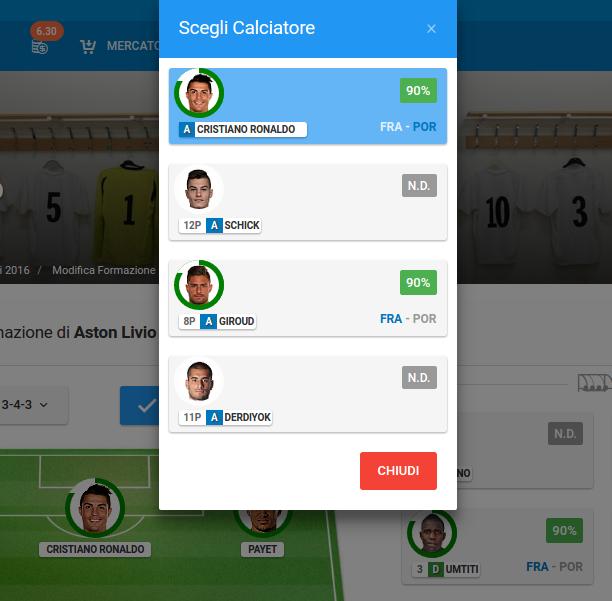 Abbiamo semplificato la scelta. Quando cliccherai su un calciatore in campo, il sistema mostrerà in automatico le informazioni statistiche e la probabilità di scendere in campo di tutti i giocatori in panchina ed in tribuna dello stesso ruolo per facilitarti nella scelta.